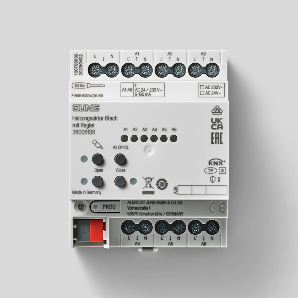 Der JUNG KNX Heizungsaktor 6-fach mit KNX Data Secure ermöglicht die zentrale Steuerung von bis zu sechs unabhängigen Heiz- oder Kühlzonen. Jede Zone kann individuell auf die gewünschte Temperatur geregelt werden. Der integrierte Regler ermöglicht die individuelle Einstellung und Überwachung der Temperatur in den einzelnen Zonen. Der Aktor ist ideal für den Einsatz in Gewerbe- und Wohngebäuden, um Heiz- und Kühlvorgänge effizienter und komfortabler zu gestalten. Durch die Möglichkeit der individuellen Zonenregelung kann der Energieverbrauch optimiert werden. Der JUNG Heizungsaktor 6-fach ist updatefähig über die JUNG KNX Service App.